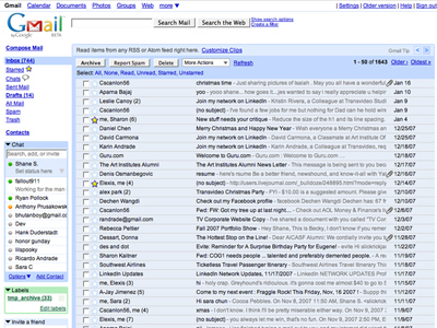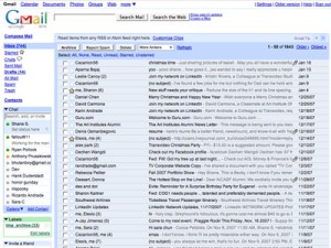 Google muss oder will nicht dermaßen den Kunden hinterher kriechen. Gmail ist ebenfalls kostenlos, bietet aber vom Start weg gleich 7GB Speicher an. Die Webanwendung braucht zwar rund zwei Sekunden zum Start, doch dafür läuft sie einfach schnell und reibungslos. Einzig das Mailmanagement ist ein wenig gewöhnungsbedürftig, da Mails nicht wirklich zwischen Ordnern verschoben werden, sondern mit Tags versehen werden – so ähnlich wie Metadaten-Tags. Was ich über Evolution-Mail kennen gelernt habe, ist die Darstellung der Konversation als Thread. Das heißt, dass sich die Auflistung der Mails zwar nach dem Eingangsdatum sortieren lässt, sie ansonsten jedoch miteinander gruppiert sind – Bezugspunkt ist dabei das darin besprochene Thema (welches sich natürlich aus der Betreff-Zeile ergibt und aus der Frage, ob der Gesprächspartner auf „Antworten“ geklickt hat ergibt). Unabhängig von irgendwelchen Ordnern kann ich so dem Verlauf eines Themas folgen und finde alle relevanten Mails direkt beieinander.
