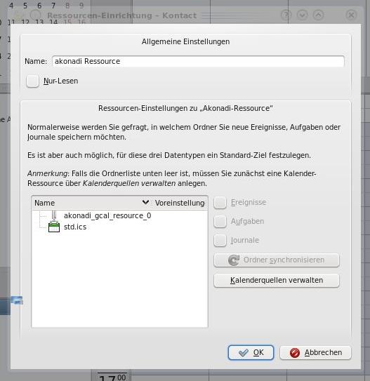 Okay, widmen wir uns als nächstes dem Kalender. Schließlich wollen wir auch die nächsten Termine und Aufgaben immer präsent haben, wenn wir an dem Rechner sitzen. Also klicken wir uns als nächstes ins Kalender-Modul, das sich unter dem Emailsymbol von eben befindet. Wer jetzt (wie ich) clever zu sein glaubt und die gleiche Richtung einschlägt wie eben, landet sofort in einer Sackgasse, denn im „üblichen“ Einstellungsfenster finden wir nichts, was uns jetzt weiter hilft. Wer eine Synchronisation allerdings schonmal mit Evolution durchgeführt hat, dem werden die beiden Einträge in der unteren, mittigen Bildschirmhälfte auffallen. Da sind zwei Kalender aufgeführt namens „Geburtstage“ und „Standard-Kalender„. Das ist der Punkt, an dem wir ansetzen wollen, denn wir wollen diese beiden durch einen neuen Kalender ersetzen. Das klingt aber leider immer noch einfacher als es ist, denn Kontact verwaltet diese Daten nicht unbedingt selbst, sondern im Hintergrund des Programms werkelt ein eigener Server namens „Akonadi„. Und genau den müssen wir mit den entsprechenden Daten füttern. Ich musste selbst auch erst Googeln und fand hier einen tollen Beitrag dazu.