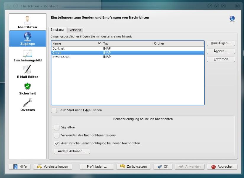 Da bin ich gleich zu Beginn schon mal in die falsche Straße abgebogen. Dort, wo man bei anderen Programmen die Liste der Emailaccounts vermutet, findet sich bei Kontact eine Liste von Identitäten. Das ist sozusagen noch eine übergeordnete Sortier-Einheit. Beim ersten Start und Einrichten sollte da aber schon was stehen, so dass wir uns da nicht weiter mit beschäftigen müssen. In der Symbolleiste ganz links am Bildschirmrand klicken wir also zuerst einmal auf das Briefsymbol mit der witzigen Bezeichnung „Email“ drunter und gelangen damit in dem Mail-Bereich des Programms. Als nächstes ein Klick in der Programmleiste ganz oben auf „Einstellungen“ und dann auf „Kmail einrichten„. Hier landen wir in einem neuen Fenster, dass uns sogleich mit den gerade genannten „Identitäten“ verunsichern will. Die lassen wir links liegen und klicken auf das Symbol darunter namens „Zugänge„. Fantastische Übersetzung, ich weiß, gemeint sind aber auf jeden Fall die Emailkonten. Um eins da reinzukriegen, braucht es einen Klick auf „Hinzufügen“ und dort könnt ihr alles wesentliche eingeben.