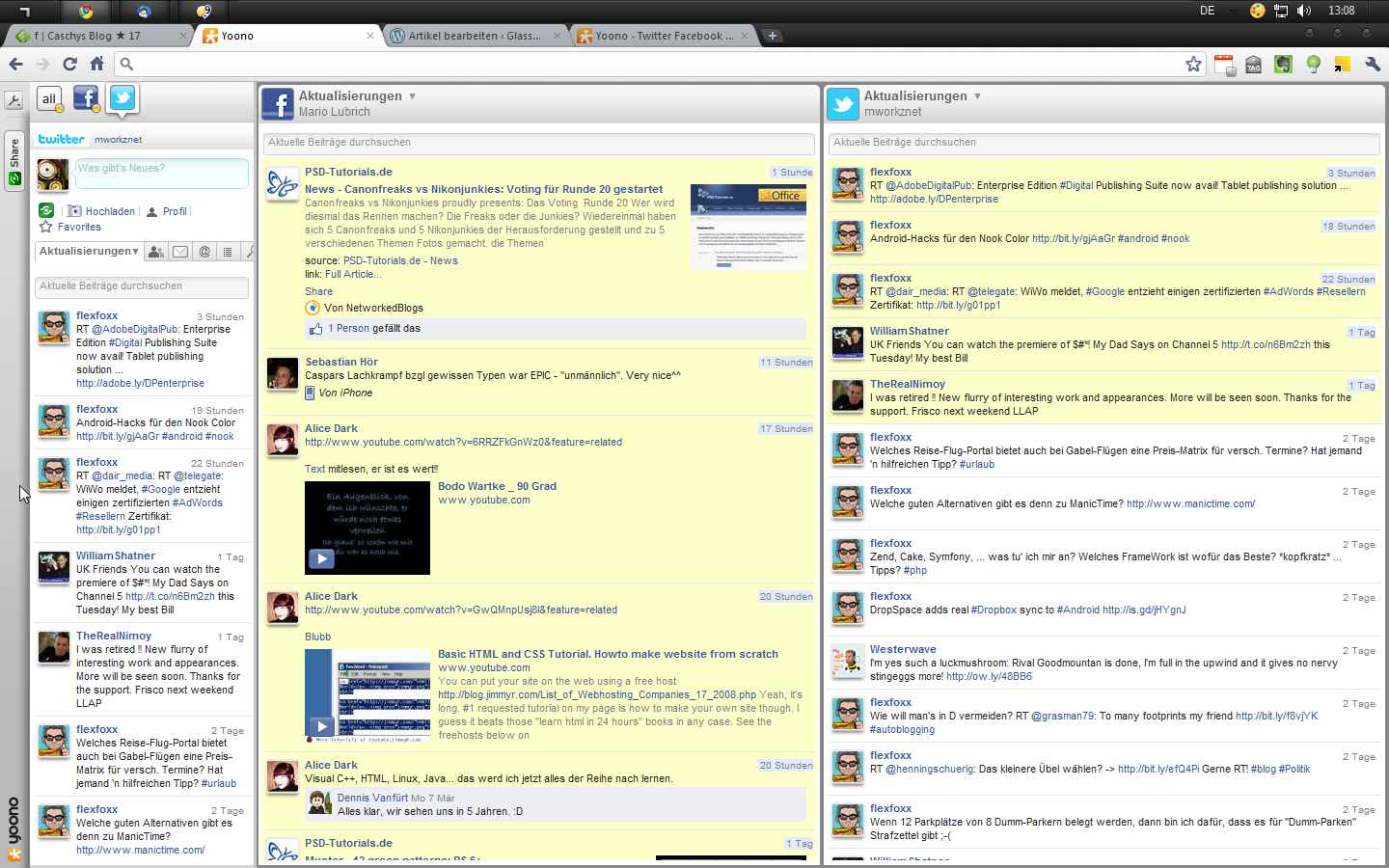 Für mich funktioniert Yoono prächtig und macht sich durch seinen kostenlosen, werbefreien und zuverlässigen Gebrauch attraktiv. Zwar werden Updates der Netzwerke nicht immer live eingespielt, aber die Meldung über neue Aktualisierungen ist unübersehbar und schnell angeklickt. Ich nutze auch nur Facebook und Twitter als Quellen, doch schon hier bieten die konfigurierbaren Spalten alles, was ich im Auge behalten möchte. Und wofür ich keine eigene Spalte einrichten will, informiert mich die Zusammenfassung auf der linken Seite immer zuverlässig. Selbst für Augentiere wie mich hält Yoono noch die Option bereit, die Erweiterung in alternativen Farbschemen darzustellen. Braucht man nicht unbedingt, ist aber eine nette Ergänzung.
