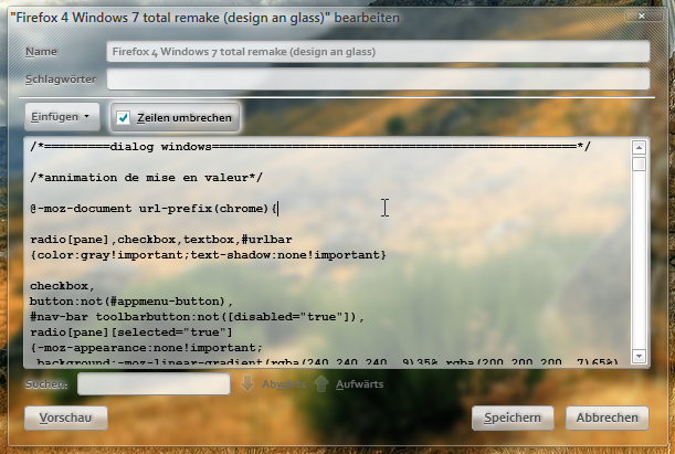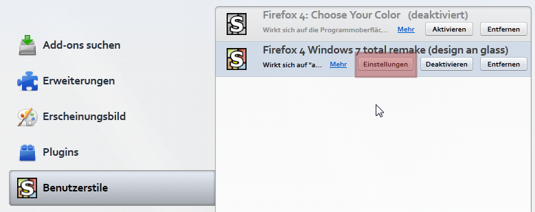 Nachdem ihr das Skript installiert habt, geht ihr im Firefox zum Addon-Manager, klickt dort auf Benutzerstile und bei dem Stil Firefox 4 Windows 7 total remake (design an glass) auf Einstellungen