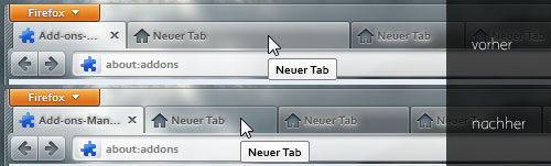 Fährt man mit der Maus über die Tabs des Browsers, so erweitern sich die Tabs mit einer Animation in der Breite. Das mag nützlich sein, wenn man mehr vom Titel des Tabs sehen will, jedoch frisst die Animation Performance und ist nicht für jeden sinnvoll. Wer sie entfernen möchte, geht in den Code zu Zeile 213 (der Abschnitt beginnt mit ‚.tabbrowser-tab‘):