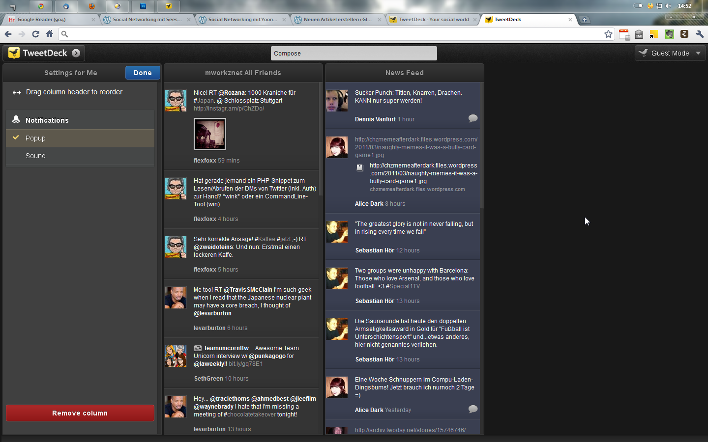 Eigentlich würde ich jetzt zu den zusätzlichen Einstellungs-Möglichkeiten der Erweiterung kommen, doch da gibt es gar nichts zu schreiben, denn die existieren schlicht nicht. Außer der Möglichkeit, einen TweetDeck-Account einzurichten, kann man nicht viel mehr machen, als alle Spalten in einer zusammen zu fassen und vice versa. Immerhin verfügt jede Spalte für sich noch über die Optionen, Benachrichtigungen dafür einzustellen oder sie zu verschieben.