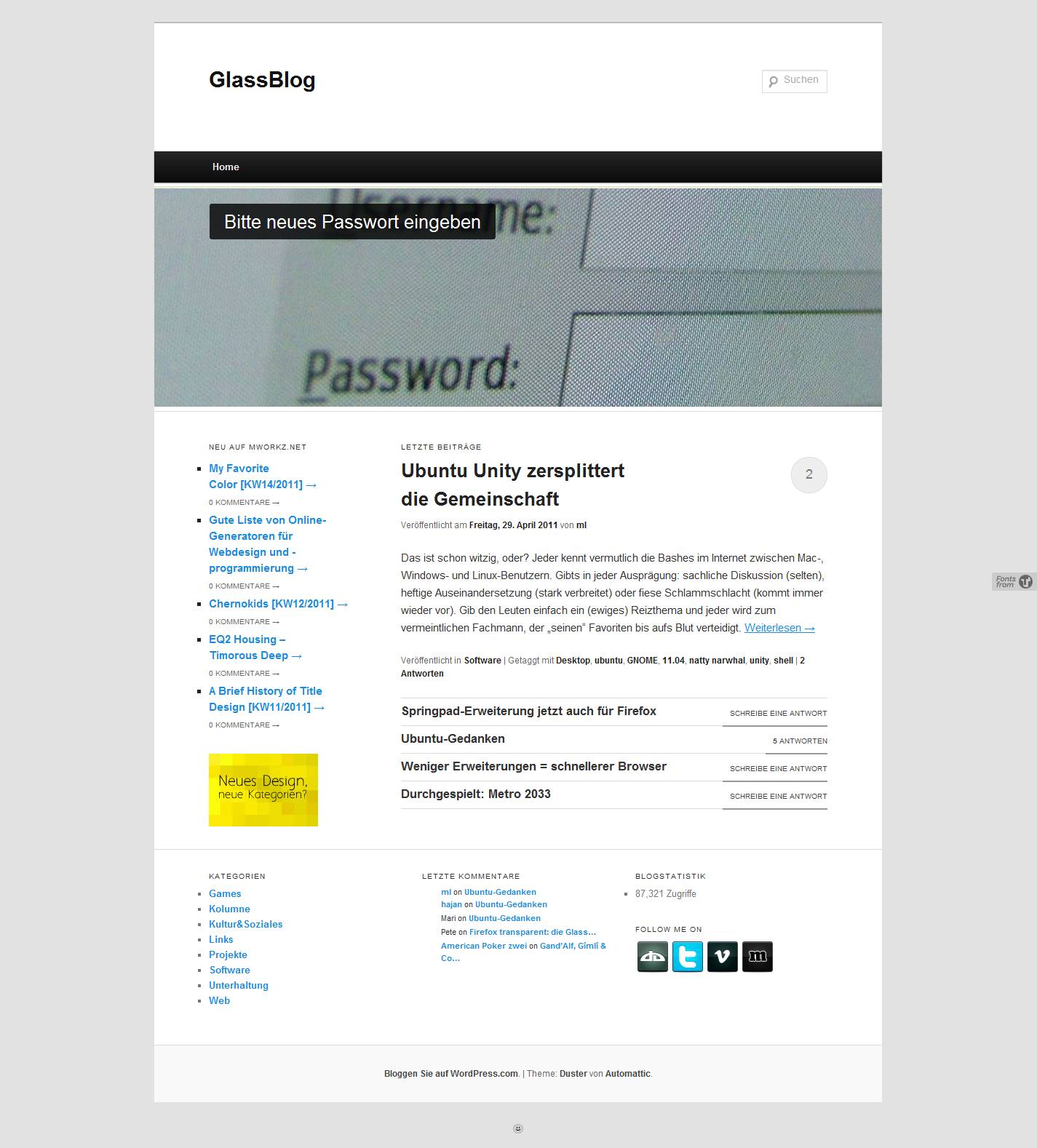 Diesen Blog hier habe ich ja schon vor einigen Wochen einer Frischzellenkur unterzogen. Auf meinem Desktop – ob Windows oder Ubuntu – mag ich es ja von jeher minimalistisch und auch im Glassblog bin ich diesen Weg seit den letzten drei verwendeten Themes gegangen. Das momentane Theme führt die Tradition fort: hauptsächlich helle Bereiche, klare Linien und wenig Bilder, die sich zusammen mit den Überschriften deutlich vom restlichen Design absetzen. Die Farbpalette der eigentlichen Seite besteht nur aus fünf Farben und statt bei jedem Beitrag ein Bild anzuzeigen (wie früher) fungiert nur noch ein einziges Artikelbild auf der Startseite als Eye-Catcher.