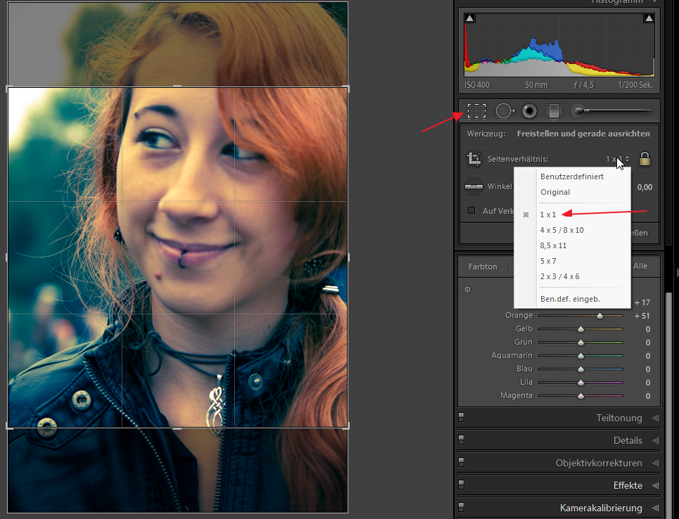 Dann erinnern wir uns an das reizvolle 1:1-Format und schneiden das Foto zu. Praktischerweise muss man das in Lightroom nicht nach Augenmaß machen, sondern kann bei dem Freistellungswerkzeug auch gleich das gewünschte Format einstellen: