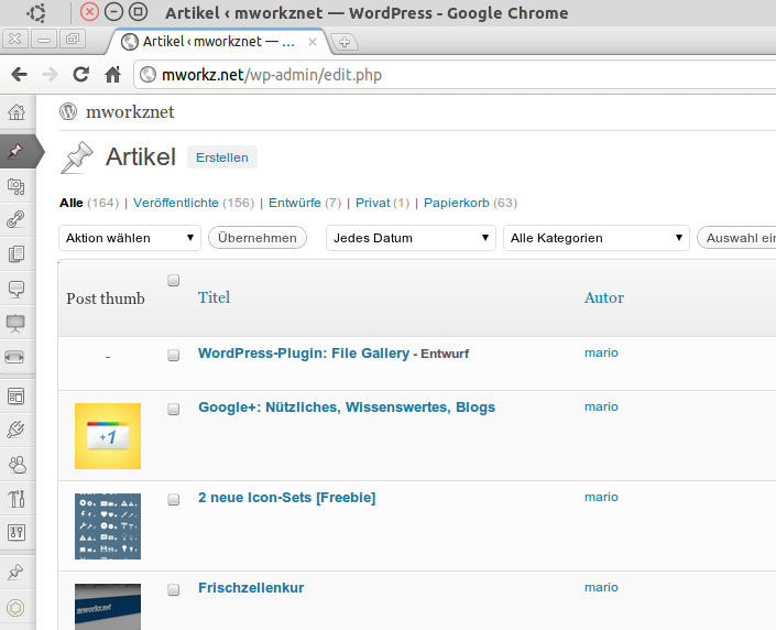 Features hat das Plugin viele, sogar noch mehr als hier angegeben. Was ich momentan jedoch ziemlich nützlich finde ist, dass auch in der Artikelübersicht im Backend von WordPress zu jedem Post angezeigt wird, ob der Beitrag ein Artikelbild hat. Dieses wird als Thumbnail angezeigt. Da ich vor Kurzem erst wieder auf die Verwaltung der Artikelbilder durch WordPress selbst umgestiegen bin, sehe ich so sehr schnell in der Übersicht, bei welchen Artikeln noch Nacharbeit angesagt ist und wo nicht.