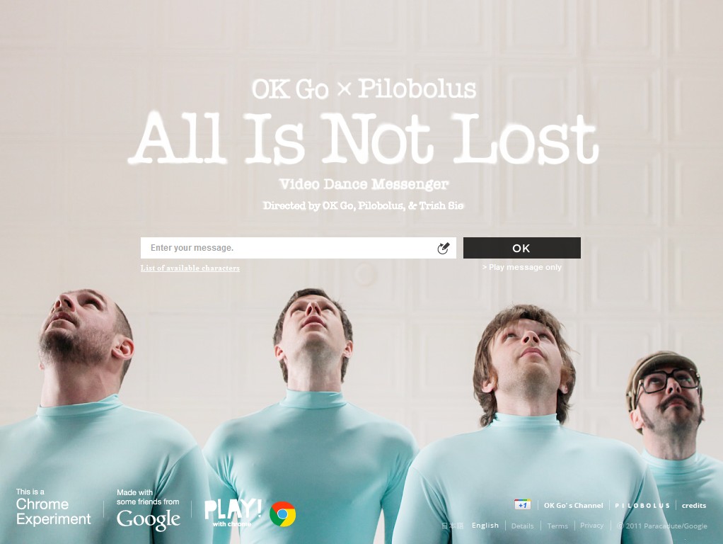 Also wenn ihr ein paar Minuten Zeit habt und ohnehin Google Chrome verwendet: auf jeden Fall mal anschauen! Ach ja: einen Trick hat das Ding auch drauf; am Anfang könnt ihr eine Message eingeben und die Leute von OK Go werden sie dann am Ende des Videos in den Clip einbauen.
