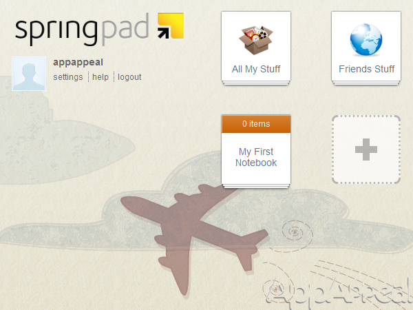 Wer eine ansprechende und abwechslungsreiche Weboberfläche mag, ist bei Springpad am Besten aufgehoben. Der zentrale Bildschirm erinnert an Smartphone-Bildschirme, da die einzelnen Notizbücher mit quadratischen Icons auf dem Bildschirm verteilt sind. Design-technisch lässt sich da jede Menge anpassen.