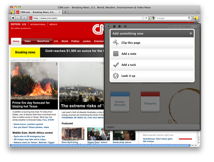Springpad spielt sich größtenteils im Browser ab. Es gibt (noch) keine Desktop-Anwendung und auch keinen Desktop-Clipper, mit dem man Sachen außerhalb des Browsers sammeln könnte.