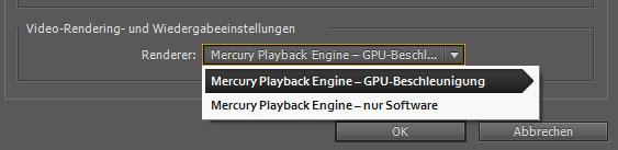 - ganz unten ist ein Dropdown-Menü, das stellt man von Software auf Mercury Playback Engine – GPU-Beschleunigung