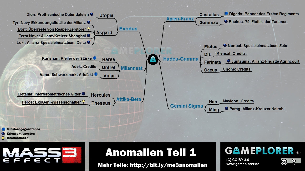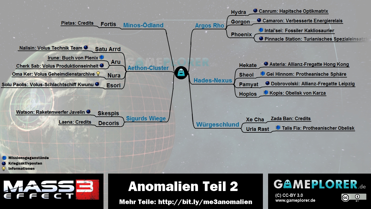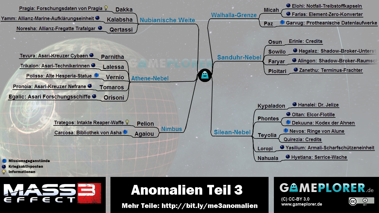 Leider gabs da nicht mehr und ist möglicherweise auch unvollständig. In der Mass Effect Wiki auf Deutsch gibts ebenfalls enttäuschend wenig in Form einer Übersicht. Erst wenn man nach einem bestimmten Cluster sucht, wird man mit einigen Infos fündig. Man klickt sich von Cluster zu den Systemen und kommt irgendwann sogar zu einer Missionsübersicht, unter der sich allerdings keine Details finden.