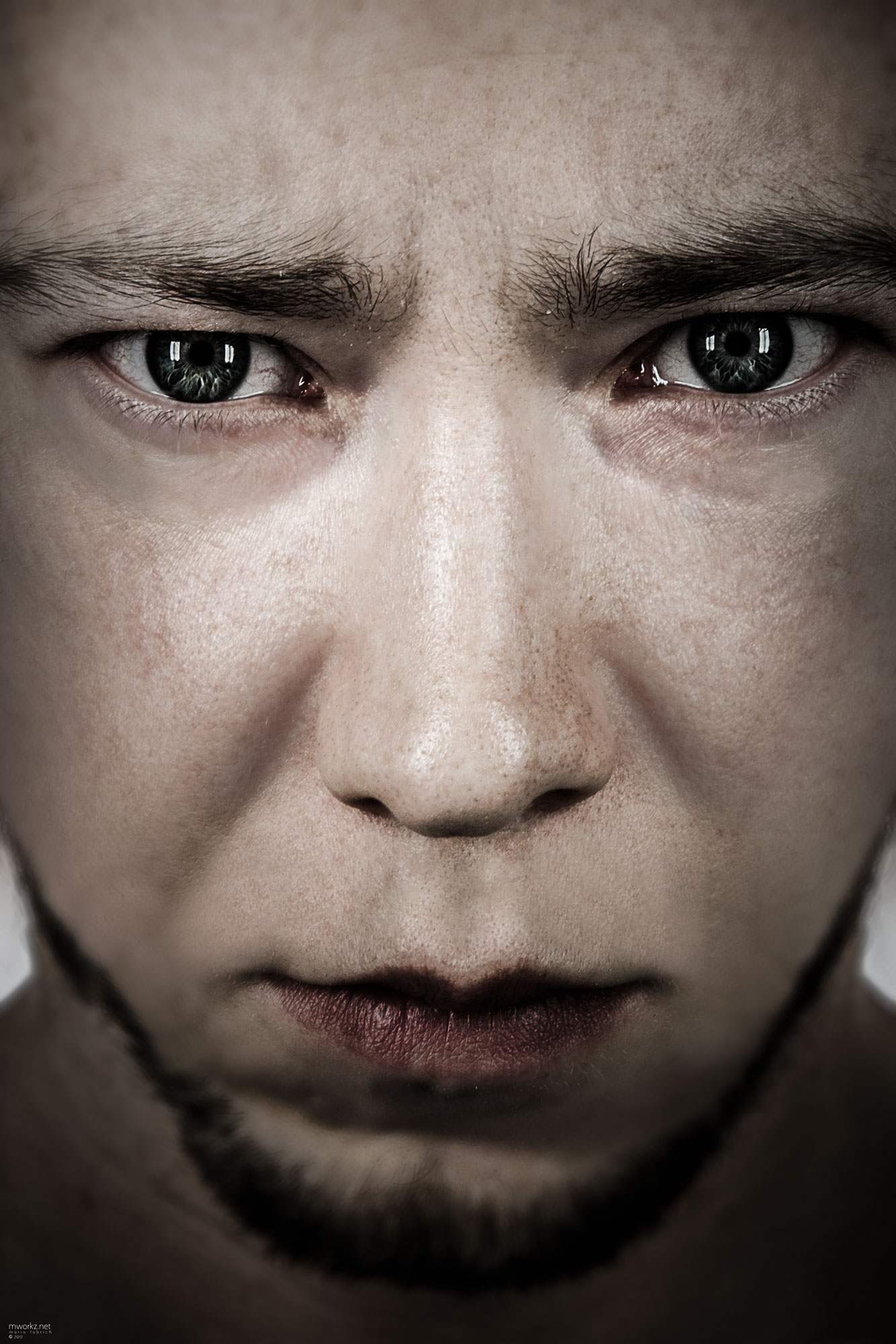 Eigentlich nur eine Spielerei, wollte ich einmal ausprobieren „was so geht“. Zur Beleuchtung habe ich zwei Studioblitze für den Hintergrund verwendet und zusätzlich zwei Tageslichtleuchten direkt neben die Kamera platziert. Das schafft zum einen eine gleichmäßige Ausleuchtung des Gesichts und zum anderen sorgt es für eine interessante Lichtspiegelung in den Augen.