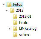 Im Ordner „Fotos“ erstellst du einen weiteren Ordner namens „2013„. Das klingt nicht nur hübsch, sondern steht für das aktuelle Jahr. Weiter. In „2013“ erstellst du nochmal zwei weitere Ordner: „LR-Katalog“ und „2013-01„. Schon schwindlig? Gut, denn jetzt kommen noch zwei: „finals“ und „online„!