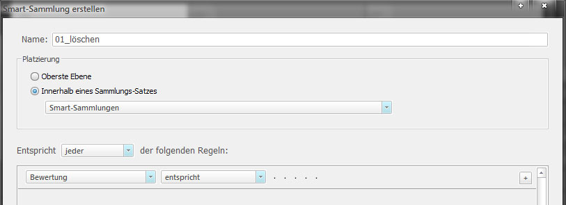 Ein neues Fenster geht auf und wartet auf deine Definition der Smart-Sammlung. Du gibst dort ein, was du auf dem Screenshot unten siehst. Die Regel für die Sammlung soll lauten, dass die Sammlung automatisch alle Bilder aufnimmt, deren Bewertung genau null Sternen entspricht. Also im Grunde das, was wir eben im Filter eingestellt haben. Und du nennst diese Sammlung 01_löschen und bestätigst mit einem Klick auf Erstellen.