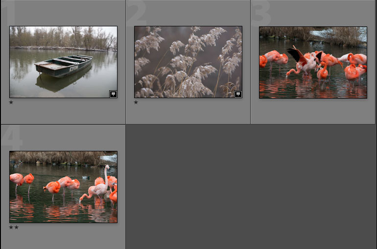 Das Boot ist mit interessanter Perspektive aufgenommen, die Gräser haben irgendetwas, ich muss mir das Bild mit anderem Licht vorstellen, und auf dem letzten Bild ist die Motiveinteilungen gelungen. Nur das erste Bild mit den Flamingos ist mir zu unruhig, das wandert in den Mülleimer. Klicke ich jetzt also auf meine Smart-Sammlung sehe ich: