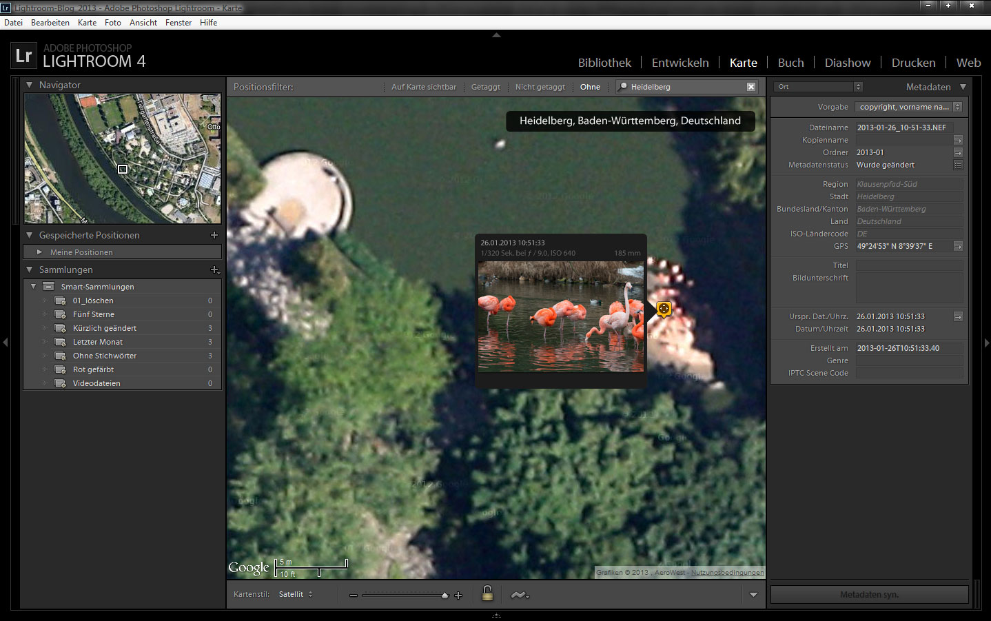 Was ich jetzt mache, ist folgendes: Ich erinnere mich, wo ich die Fotos von den Flamingos gemacht habe. Also gebe ich im Suchfenster in der Mitte oben rechts (Karte durchsuchen) das Wort Heidelberg ein. Toller Technik sei dank, findet er diese Stadt auch und scrollt die Karte dorthin. Allerdings aus schätzungsweise fünfundachtzig Kilometern Höhe. Ich wills aber genauer! Also zoome ich mit dem Mausrad rein, bis ich mich orientieren kann. Flamingos laufen nicht gerade überall in der Stadt rum und ich erinnere mich noch schwach, dass ich Eintritt bezahlen musste, um die Fotos zu machen. Ich scrolle und zoome also so lange, bis ich den Heidelberger Zoo gefunden habe. Ich wills aber noch genauer! Also zoome ich noch weiter hinein, bis ich den kleinen Weier im Zoo entdecke, in dem die Flamingos auf einem Bein gepennt haben. Witzig: auf Googles Satellitenfoto sind sie sogar auch drauf!