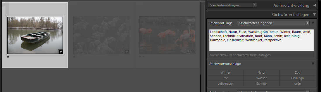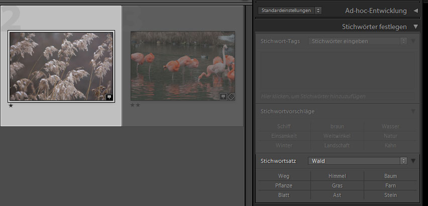 Jetzt kommen wir noch zu ein paar Annehmlichkeiten von Lightroom. Zuerst: die Stichwortsätze. Ich habe es bereits erwähnt, wenn ich einen Baum im Bild habe, dann ist das gleichzeitig ein Lebewesen, dann ist das Natur und vielleicht auch Landschaft, auf jeden Fall aber eine Pflanze.