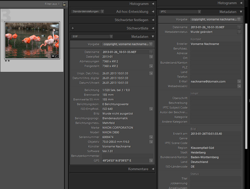 Unter der Werkzeugpalette Stichwörter findest du in Lightroom die Palette Metadaten. Der Metadaten-Bereich eines Fotos enthält verschiedene Abschnitte, die beiden wichtigsten habe ich dir in diesem Screenshot mal nebeneinander gepackt: EXIF und IPTC: