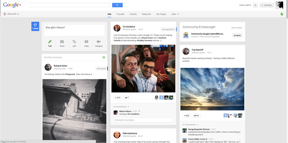 Oben hat man ganz unauffällig die „Filter“ des eigenen Streams als schlichte Worte platziert. So kann man schnell die gewünschten Kreise auswählen, von denen man Neues sehen will. Links und rechts hat Google die Werkzeugleisten eingeklappt. Sie fallen kaum auf und vor allem auf der rechten Seite darf Facebook sich abschauen, wie man eine komfortable Chat-Leiste gestaltet. Links schaltet man sich durch die G+-Bereiche: das eigene Profil, die eigenen Fotos, die Communities, in denen man Mitglied ist usw.