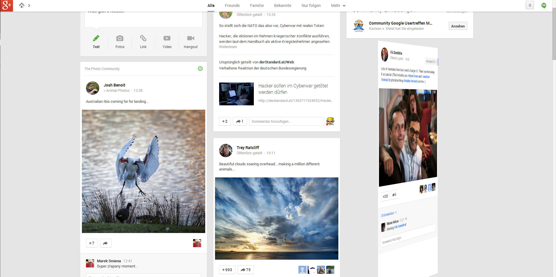 Ich hatte hier ja mal versucht, eine Diskussion um die Pro und Kontras einzelner Netzwerke anzustoßen. Kam zwar leider nicht viel Feedback, aber zumindest für mich hat sich der Fokus mal wieder deutlicher nach Google+ verschoben. Nicht nur, weil das Netzwerk Fotografen liebt, sondern auch, weil deutlich wird: während Facebook immer nur umgestaltet und zu verbergen versucht, dass die Technik veraltet ist, tut sich bei Google+ immer wieder etwas.