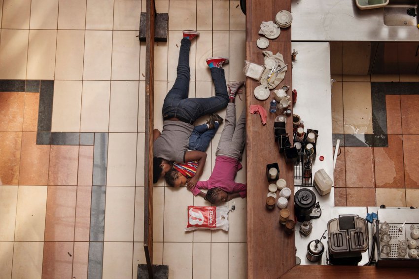Eine Frau mit ihren zwei Kindern verstecken sich. Tony Hicks schlich sich in das Kaufhaus in Nairobi, während es von somalischen Dschihads angegriffen wurde.