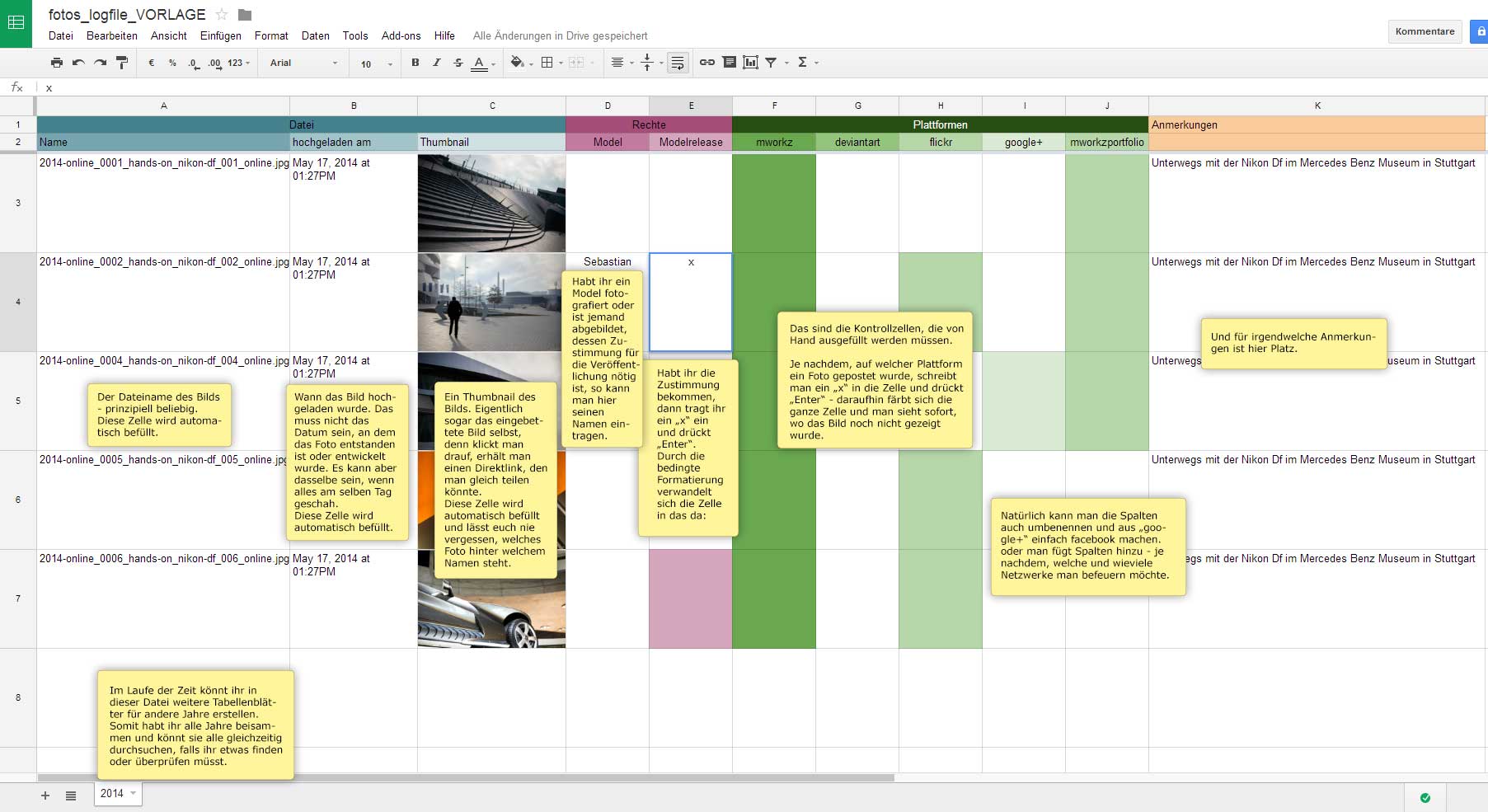 Dort hinein kommt eine Tabellendatei namens “fotos_logfile”. Diese ist sehr differenziert aufgebaut und sogar mit bedingten Formatierungen ausgestattet. Kurz: es ist etwas kompliziert, zu erklären, wie man die Tabelle anlegt. Ich zeige sie euch mal und erkläre sie: