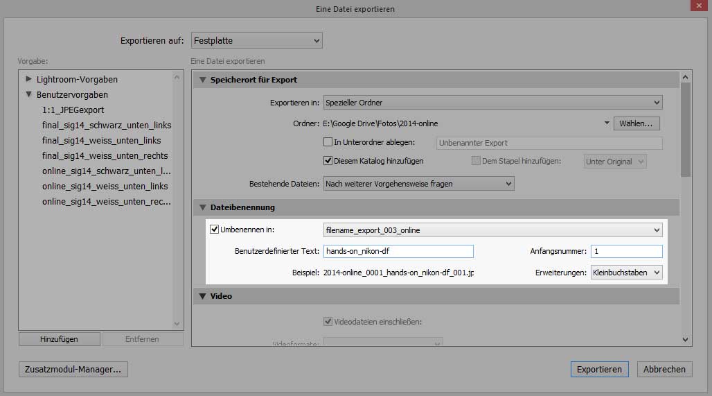 Solltet ihr mehr als ein Foto auf einmal exportieren, ist das kein Problem – das fängt meine Vorlage mit der Variable “Bildnummer” ab und vergibt daher eindeutige Namen. Diese Zahl wird aber bei jedem Exportvorgang wieder mit “001” anfangen.