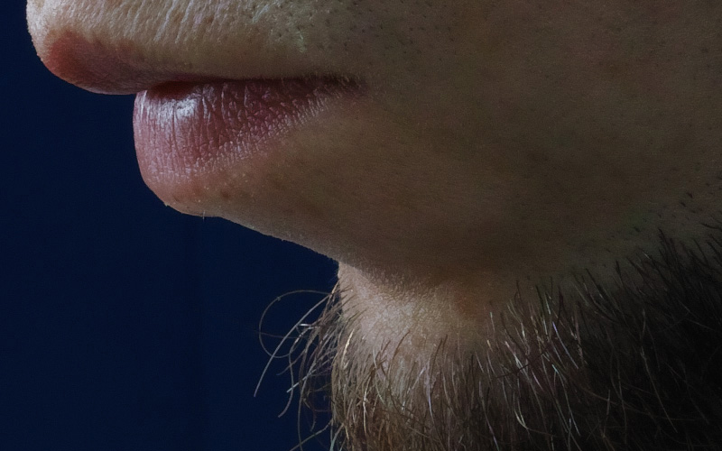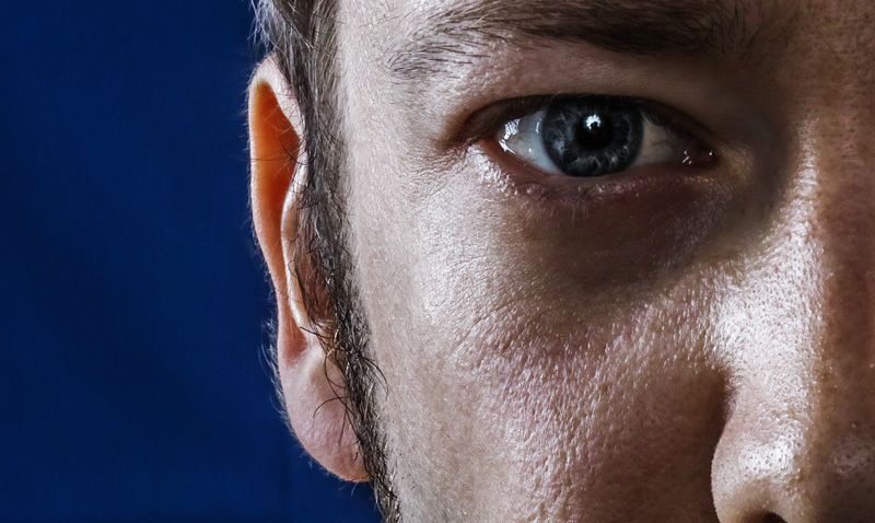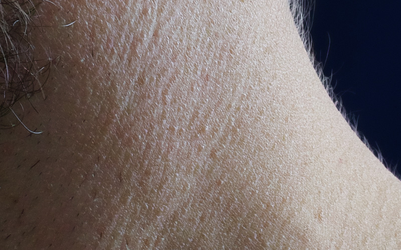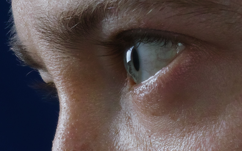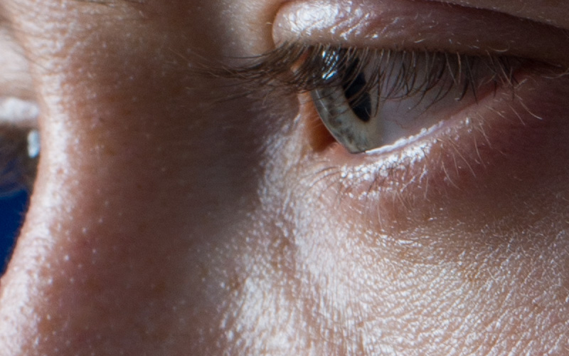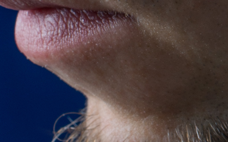 Ihr seht einen 100-Prozent-Ausschnitt einer Aufnahme, die aus einem Abstand von etwa einem halben Meter gemacht wurde. Vielleicht stimmt ihr mir zu, wenn ich behaupte, dass der Bildeindruck einen schlicht aus den Socken bläst. Jedes unrühmliche Detail bis hin zu Hautschuppen ist zu sehen, gleichzeitig bleibt ein Eindruck von Tiefe und ein fast dreidimensionales Gefühl für das Motiv entsteht.