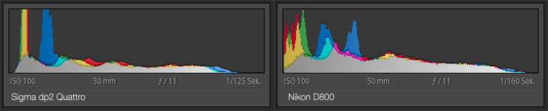 Ebenfalls auffällig ist der scheinbar größere Dynamikumfang der D800. Hier ist eine enorme Bandbreite zwischen hellen und dunklen Bildbereichen vertreten und dazu noch eine ganze Staffel dazwischen liegender Töne. Die Histogramme bestätigen das: Die D800 weist ein reichhaltigeres Angebot an Tönungen auf und hält diese ausgezeichnet im Zaum während bei der Quattro die Farben in den Schattierungen leicht ausreißen. Davon agesehen gehen kaum Bilddetails verloren – fast überall ist Zeichnung drin. Die enge Staffelung des Histogramms verweist außerdem auf einen kräftigen Kontrast.