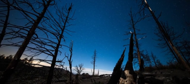 Normalerweise sieht man bei nächtlichen Zeitrafferaufnahmen immer, wie der Himmel samt seinen Sternen über den Horizont wandert. Page dreht es genau um. Er fixierte den Nordstern und drehte mit einer motorbetriebenen Vorrichtung die Kamera mit. Daraus ergibt sich ein interessanter Blick aus Sicht der Sterne. Denn eigentlich drehen wir uns ja tatsächlich permanent im All durch die Gegend…