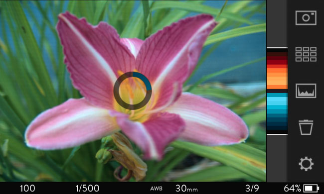 Vor allem auf dem Monitor, der gleichzeitig als Sucher dient, ist eine Menge los. Das Menü drängt sich sehr unscheinbar an die rechte Seite – daneben ist eine Skala zu finden, auf der etwas dargestellt wird, das wie ein in gold und blau geteiltes Histogramm aussieht. Das ist eine Entfernungsskala, die dem Fotografen zeigt, wo Vorder- und Hintergrund des Motivs erkannt wurden und wie weit beide entfernt sind. Eine Live-Ansicht zeigt das ganze nochmal in Echtzeit – die Bildbereiche werden dann von goldenen und blauen Flecken überlagert. Hier spürt man dann doch den Rechenaufwand, denn die Darstellung läuft meist nicht mehr flüssig ab. Angenehm ist immerhin die Bedienung der Kamera. Viele Wischgesten, die man auch vom Smartphone her kennt, lassen sich anwenden und die Bildschirmwechsel erfolgen flott.