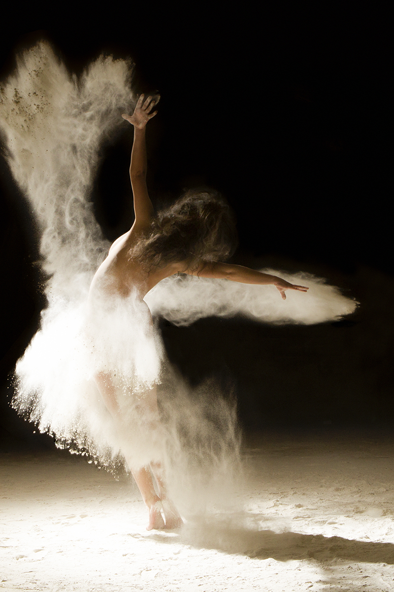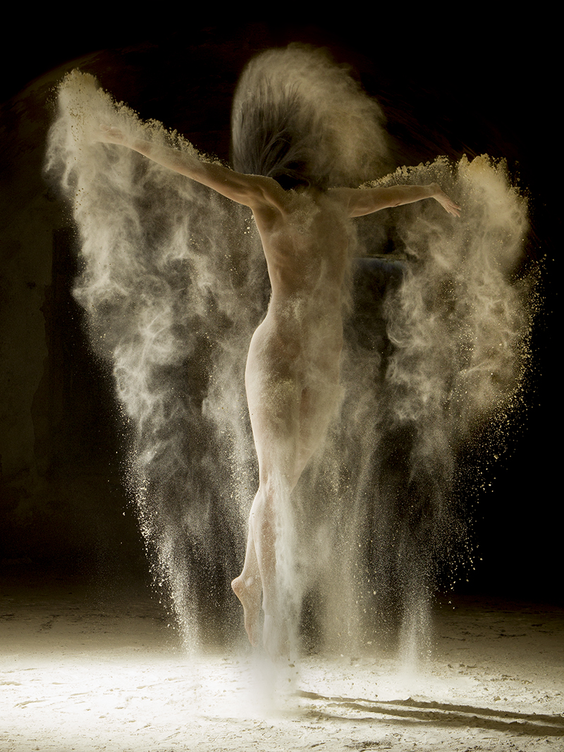 Der Einfachheit halber sind die meisten derartigen Motive so gestaltet, dass das Model posed und ihm ein Assistent von außerhalb des Bildes Mehl oder ähnliches ins Gesicht wirft. Bei Florents Bildern werfen die Models überwiegend selbst. So entstehen Flügel, Umhänge und Bögen. Und gerade das ist eine komplizierte Aufgabe für die Models, die an ihre Haltung denken müssen, deren Körperspannung die eines Brückenpfeilers sein muss und die dann auch noch im richtigen Moment das Mehl herumwerfen müssen.