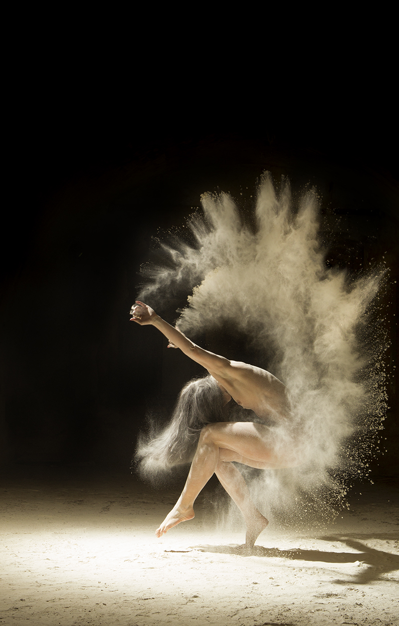 Ich würde mal wetten, dass es Florent gelungen ist, (Ballet-)Tänzerinnen für das Projekt zu gewinnen. Ein großer Vorteil, denn die Damen sind beweglich, können außergewöhnlichere Körperhaltungen einnehmen und haben ein exakteres Körpergefühl. Das ist nämlich nötig, um Staub so fallen und werfen zu lassen, damit er eine Form bekommt.
