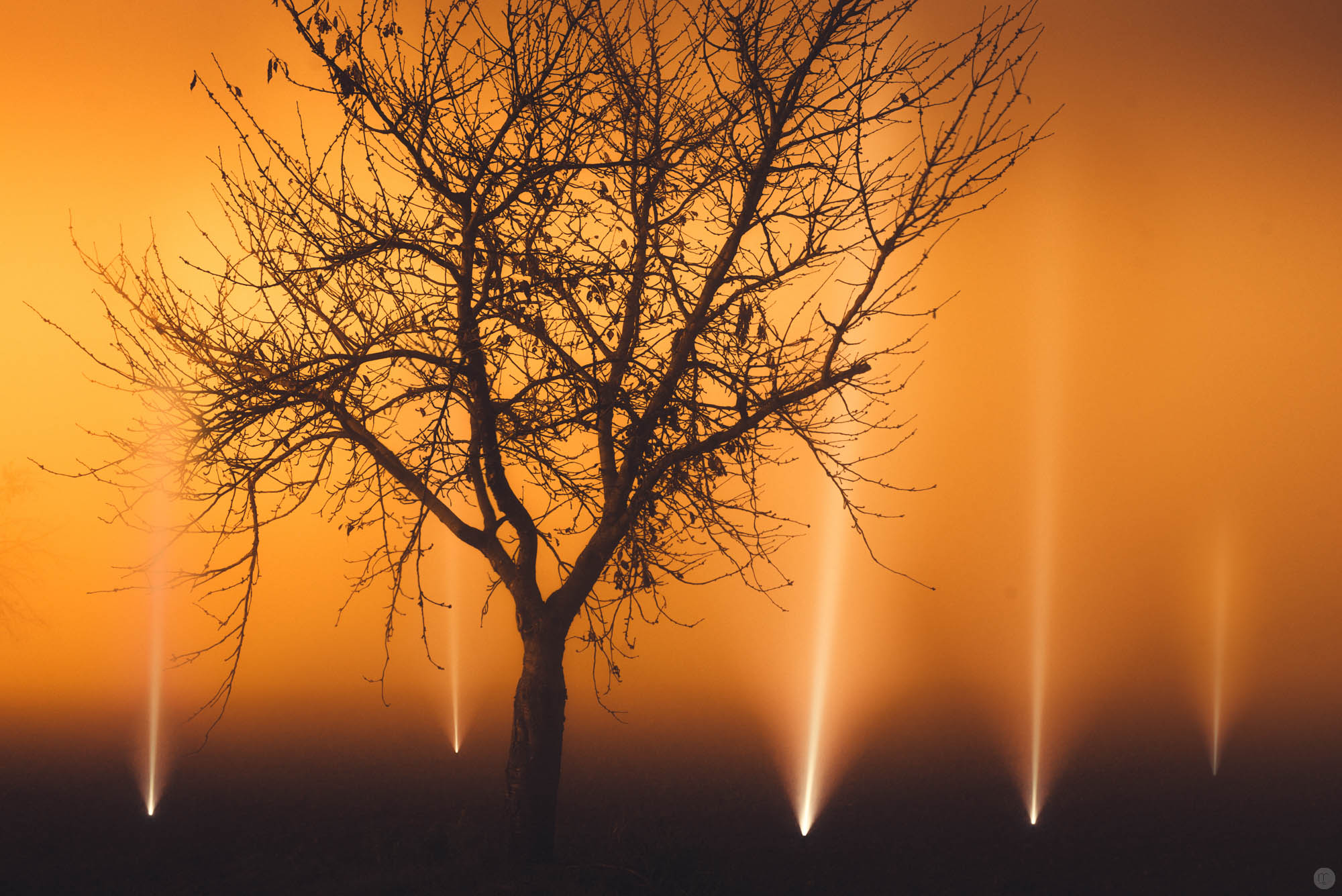 Und es hat mich an einen Abend vor ein paar Monaten erinnert, an dem das obige Foto entstand. Vermutlich wäre es mit Photoshop einfacher zu machen gewesen. Stattdessen stand ich insgesamt zwei Stunden lang in der nebligen Kälte eines abgelegenen Ackers und fotografierte eine Taschenlampe, die ich abwechselnd an verschiedenen Orten in die Erde steckte.