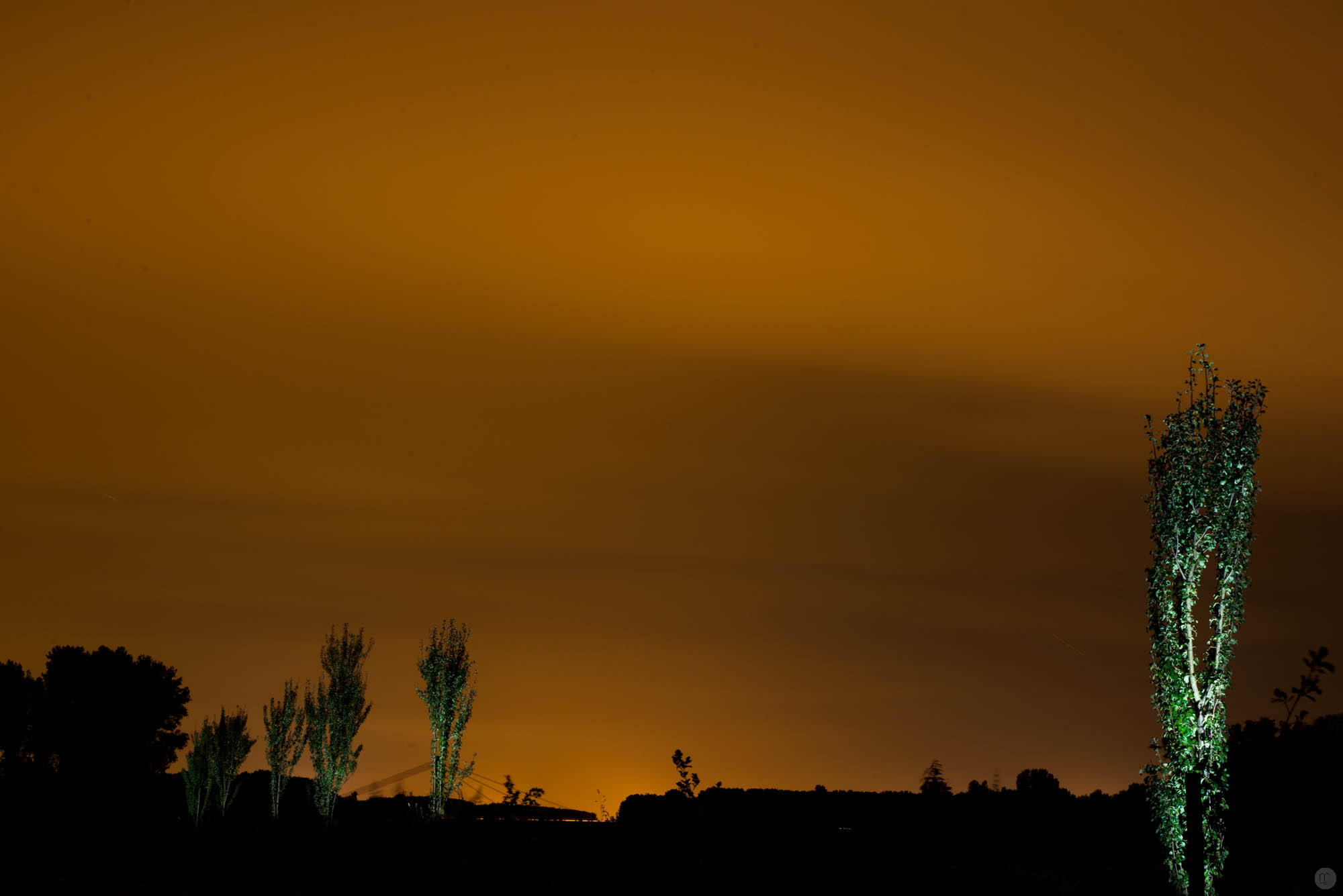 Ein nächtlicher Schnappschuss: Mehrminütige Langzeitaufnahme, während der ich ein paar hundert Meter gelaufen bin und irgendwelche Bäumchen mit einer Taschenlampe „angemalt“ habe.
